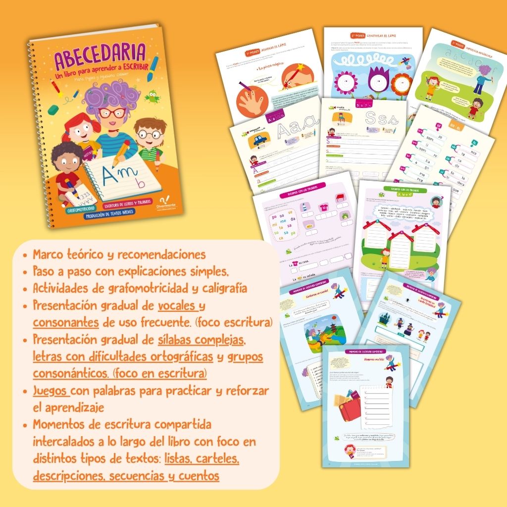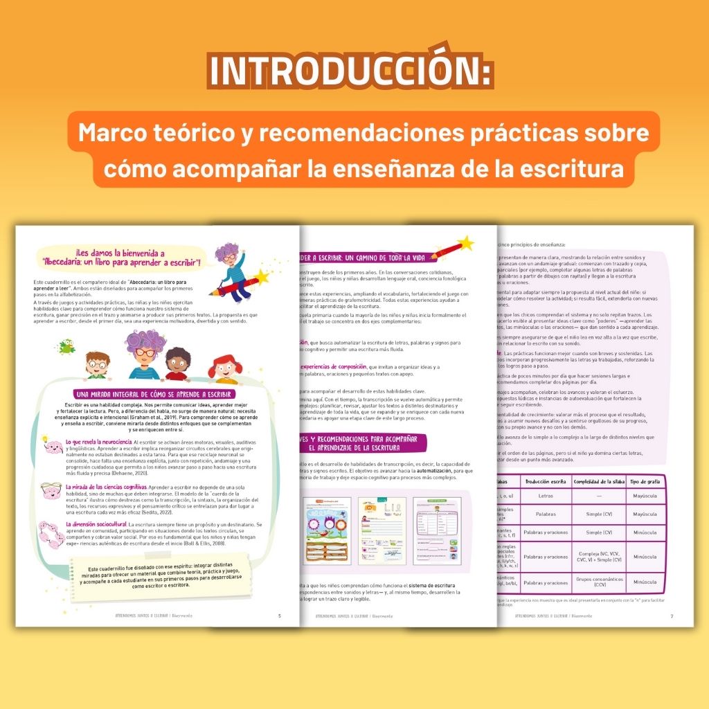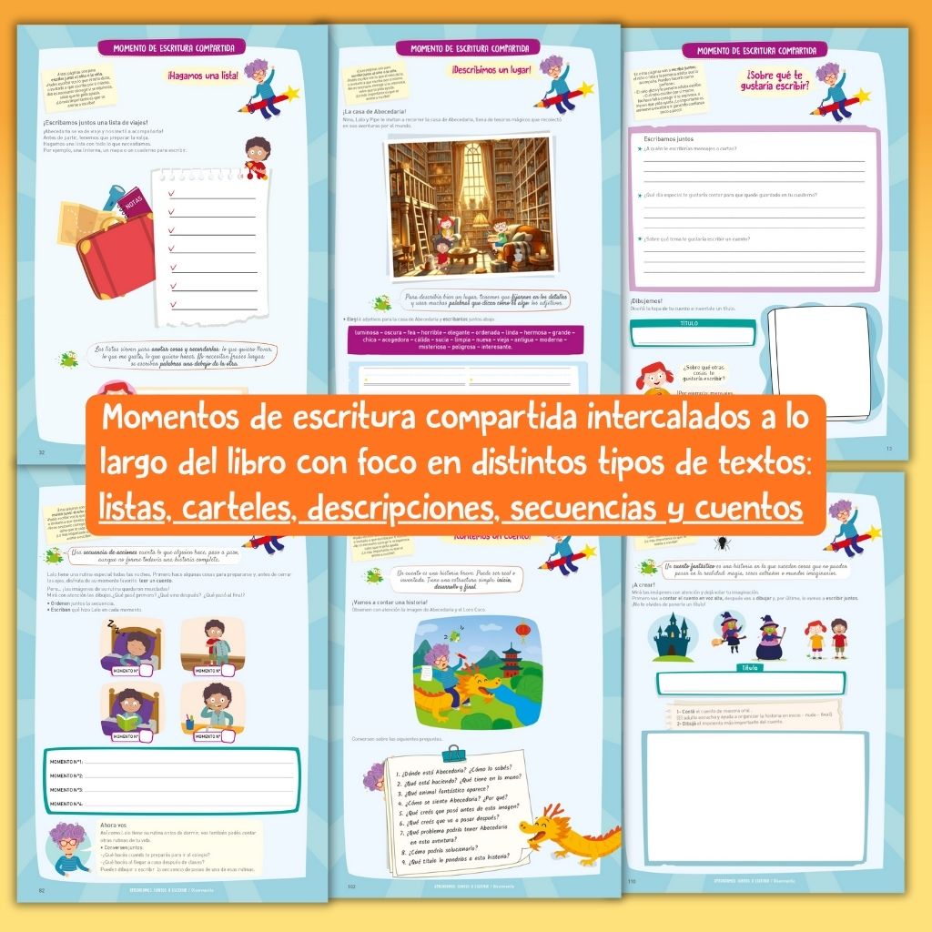 - Momentos de escritura compartida intercalados a lo largo del libro con foco en distintos tipos de textos: listas, carteles, descripciones, secuencias y cuentos