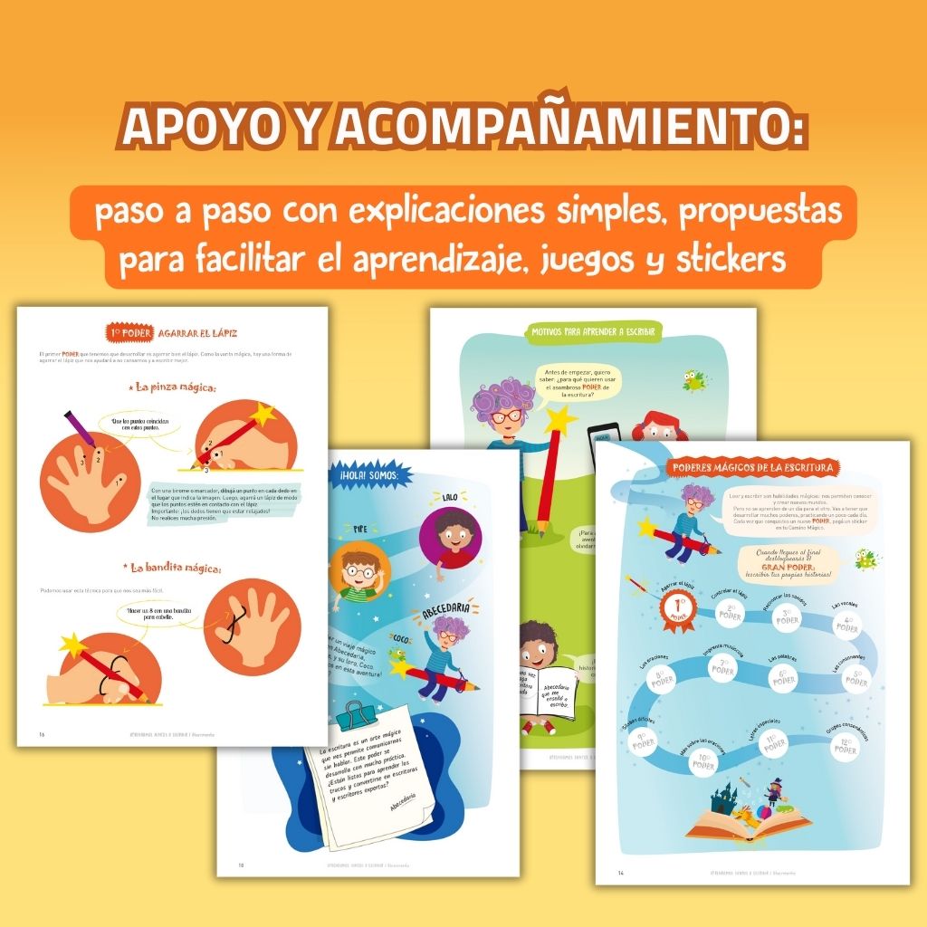Acompaña los primeros pasos en la escritura con actividades breves y motivadoras. A través de propuestas progresivas, los niños y las niñas ejercitan la grafomotricidad, relacionan sonidos y letras y comienzan a escribir palabras, oraciones y pequeños textos. Trabaja dos ejes esenciales: