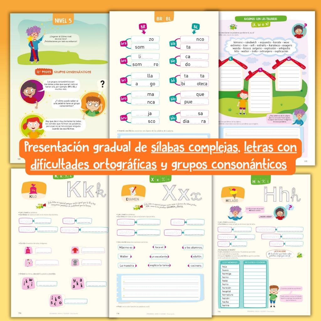 - Presentación gradual de sílabas complejas, letras con dificultades ortográficas y grupos consonánticos. (foco en escritura)