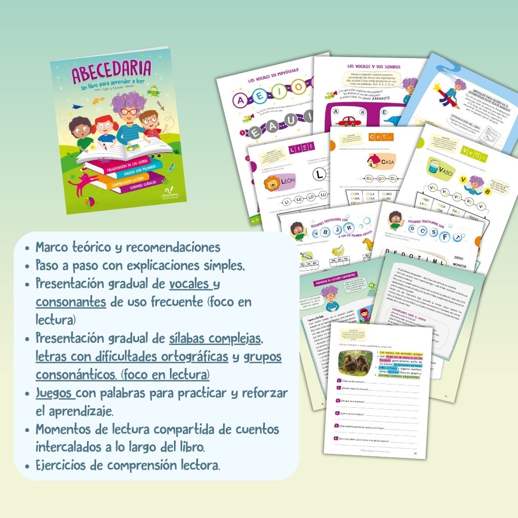 1) Libro Abecedaria: Un libro para aprender a leer: Un libro para aprender a leer desde el reconocimiento de letras y sonidos hasta la comprensión de textos largos. A través de propuestas progresivas, los niños y las niñas ejercitan el reconocimiento de las letras y sus sonidos, lectura de sílabas, palabras y oraciones hasta la comprensión de textos breves.