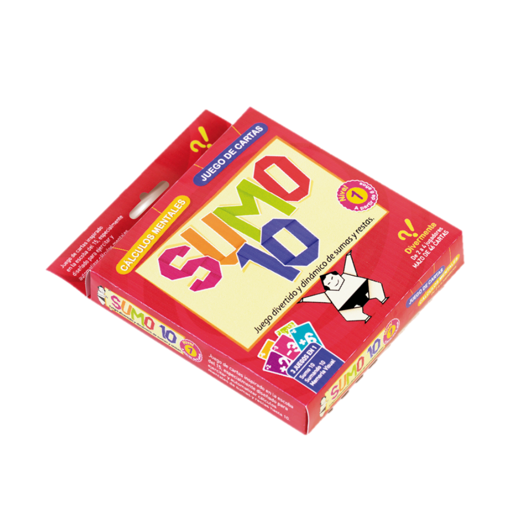 9) Sumo10 (6 a 99 años): Un juego de cartas para automatizar sumas y restas a 10. Similar a la escoba del 15, pero a 10.